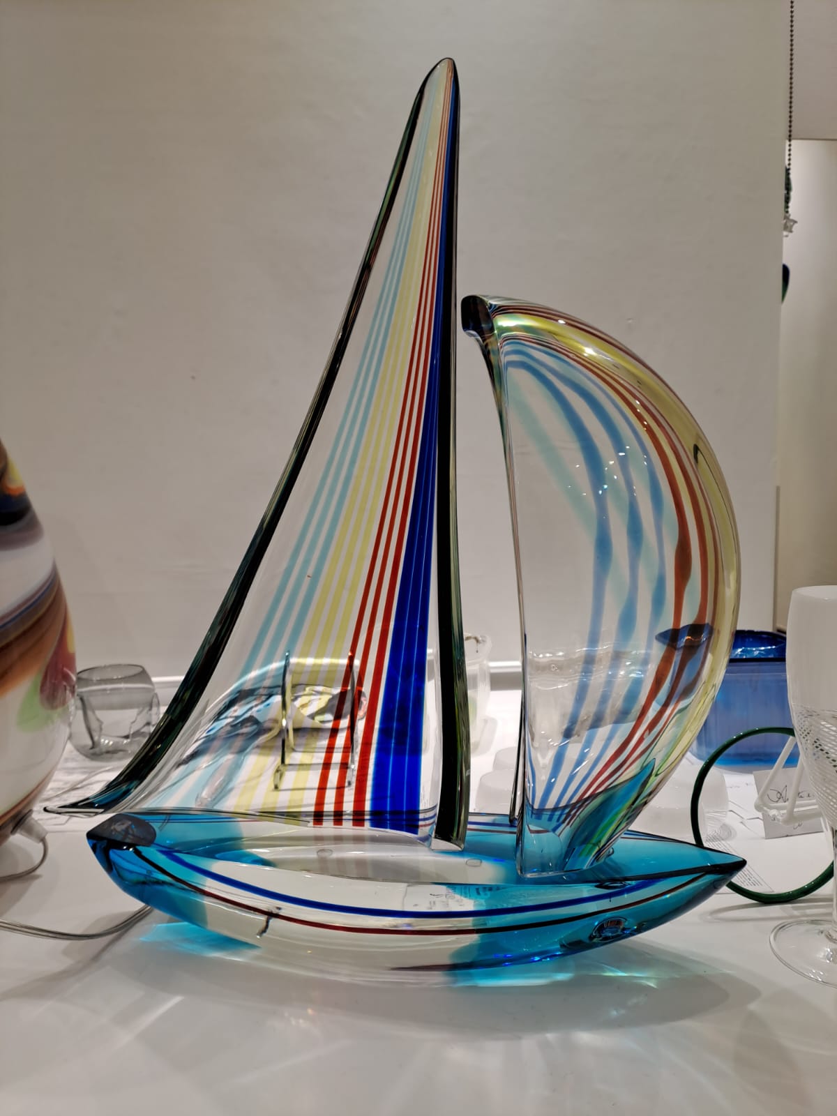 A wonderful example of Muranese art: each piece of this sailboat is handmade separately with inclusions of multicoloured canna.