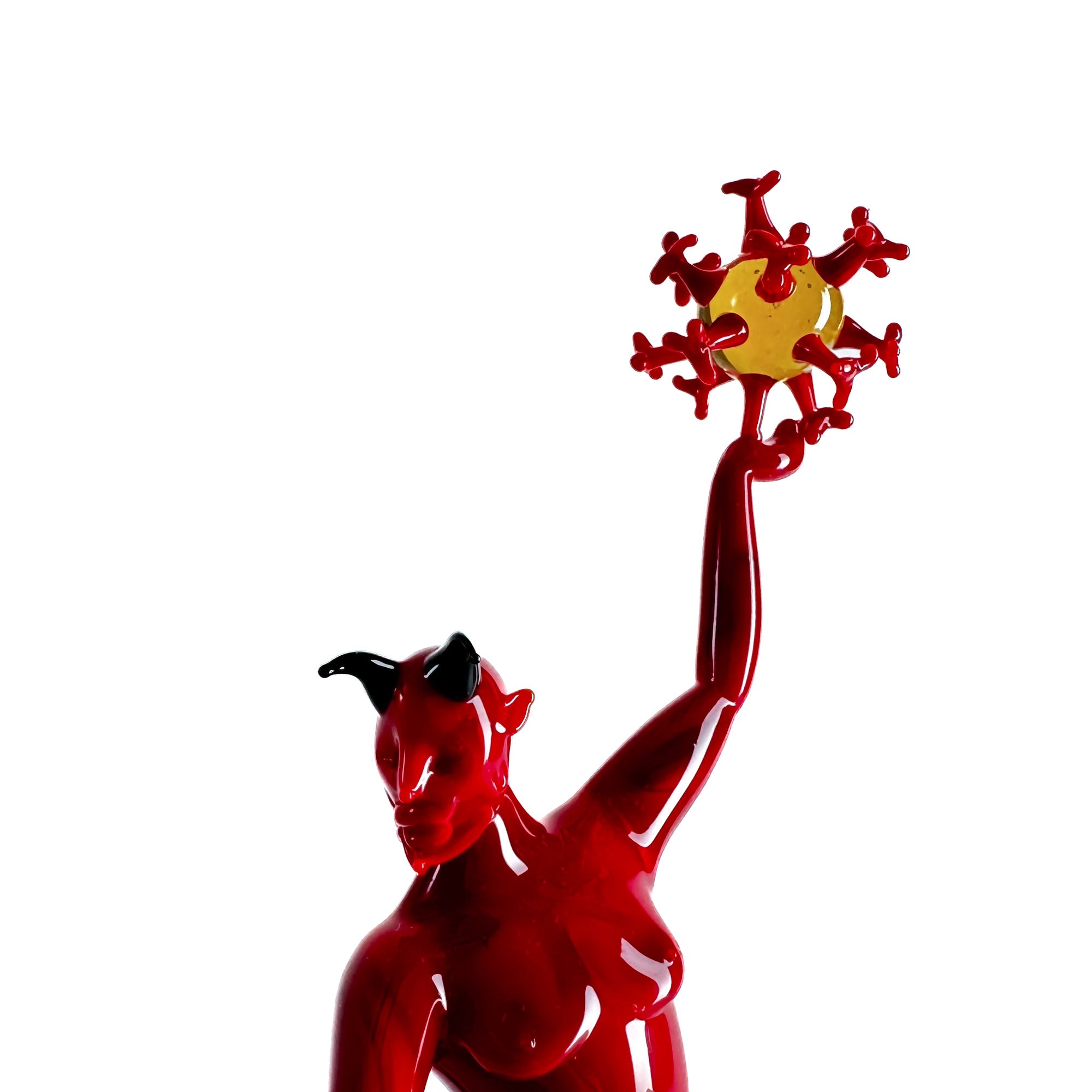 The devil figure is holding a clear glass virus in one hand and a clear glass syringe in the other, adding a modern touch to the piece.