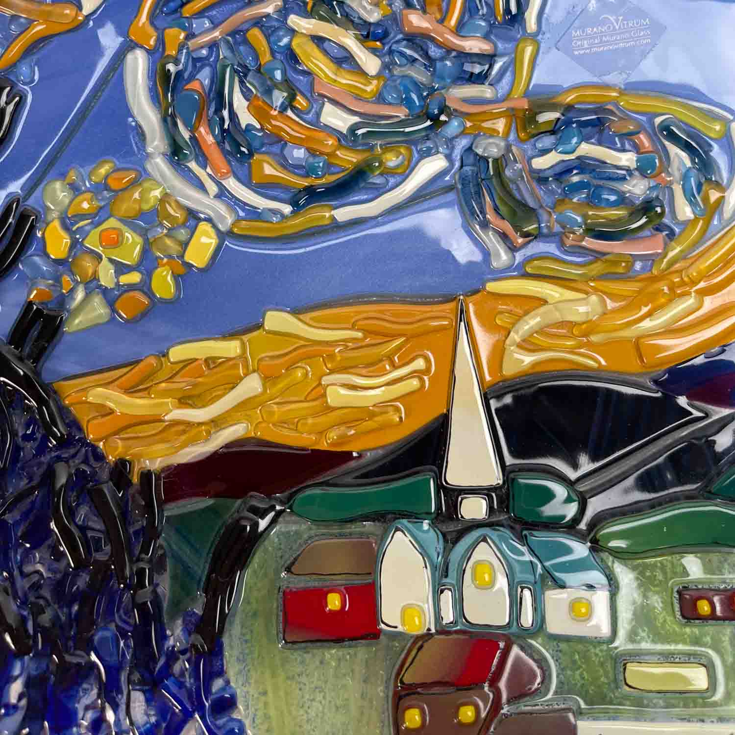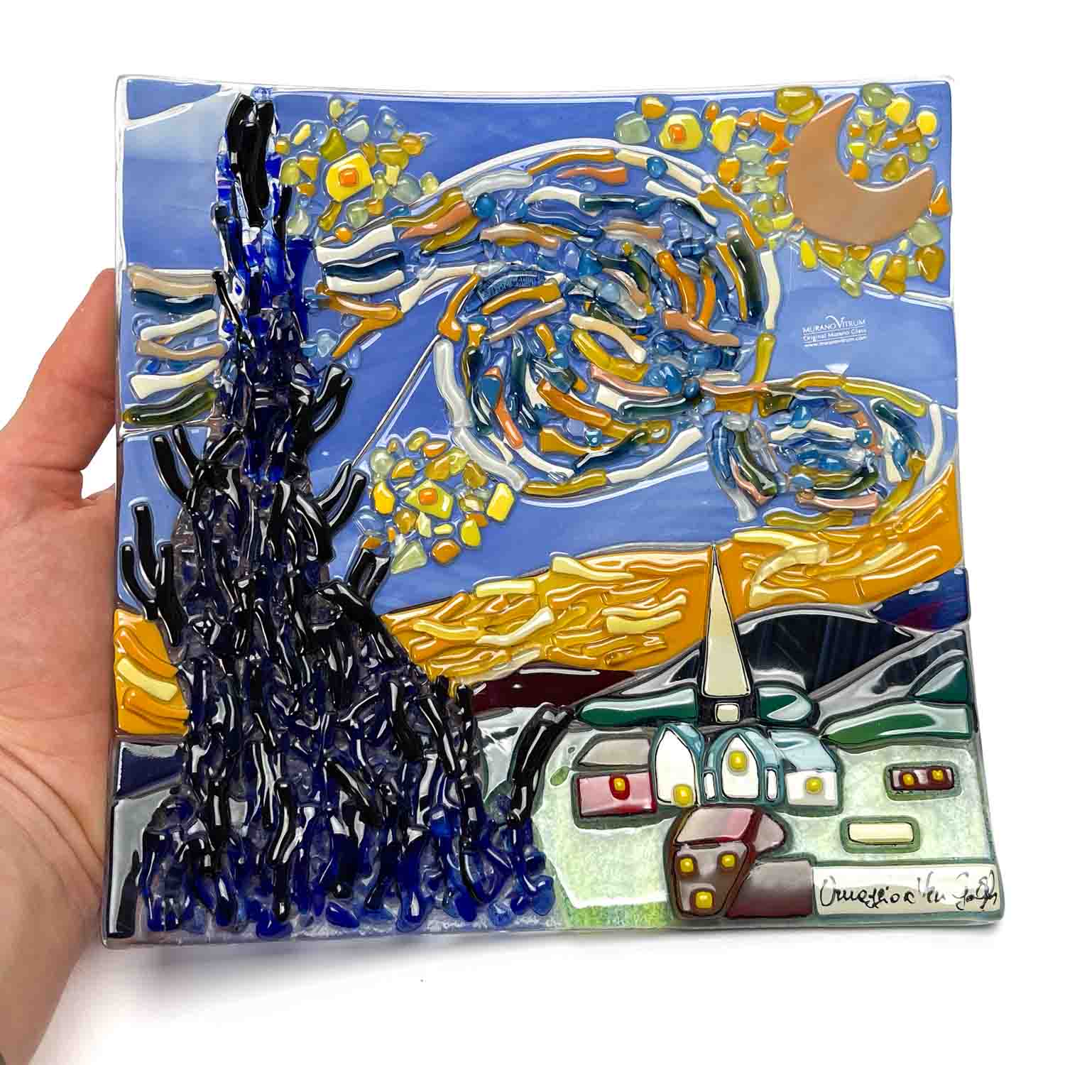 This exquisite decorative plate captures the mesmerizing beauty of Vincent van Gogh's iconic masterpiece, "Starry Night," through the art of glass mosaic. The plate shows the enchanting night sky that has become synonymous with Van Gogh's name.