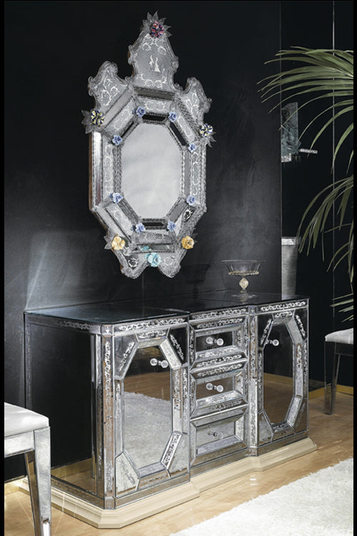 Important cupboard in classic Venetian style of the XVIII Century bevelled and smartly etched; inside and frames in lacquered brilliant ivory colour.