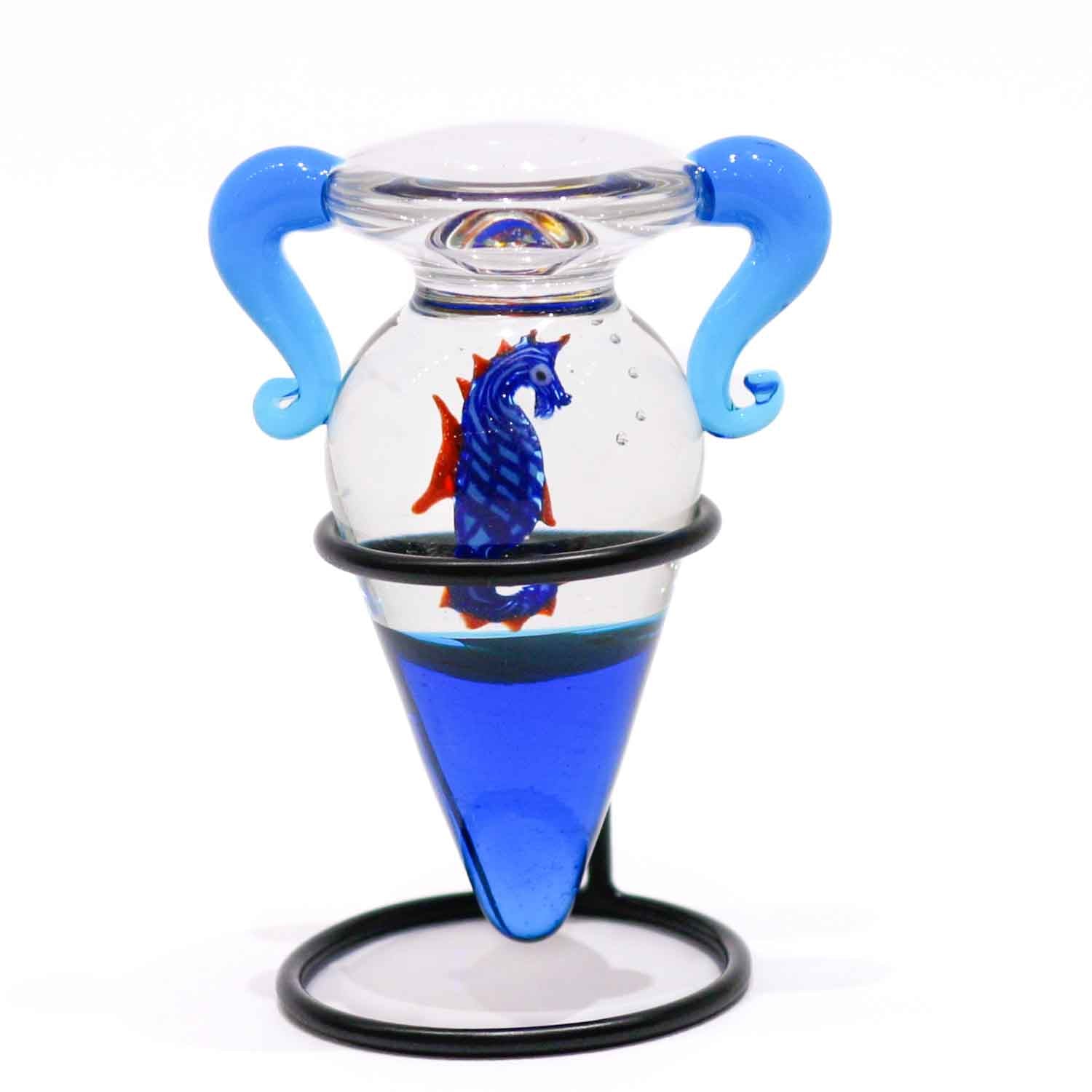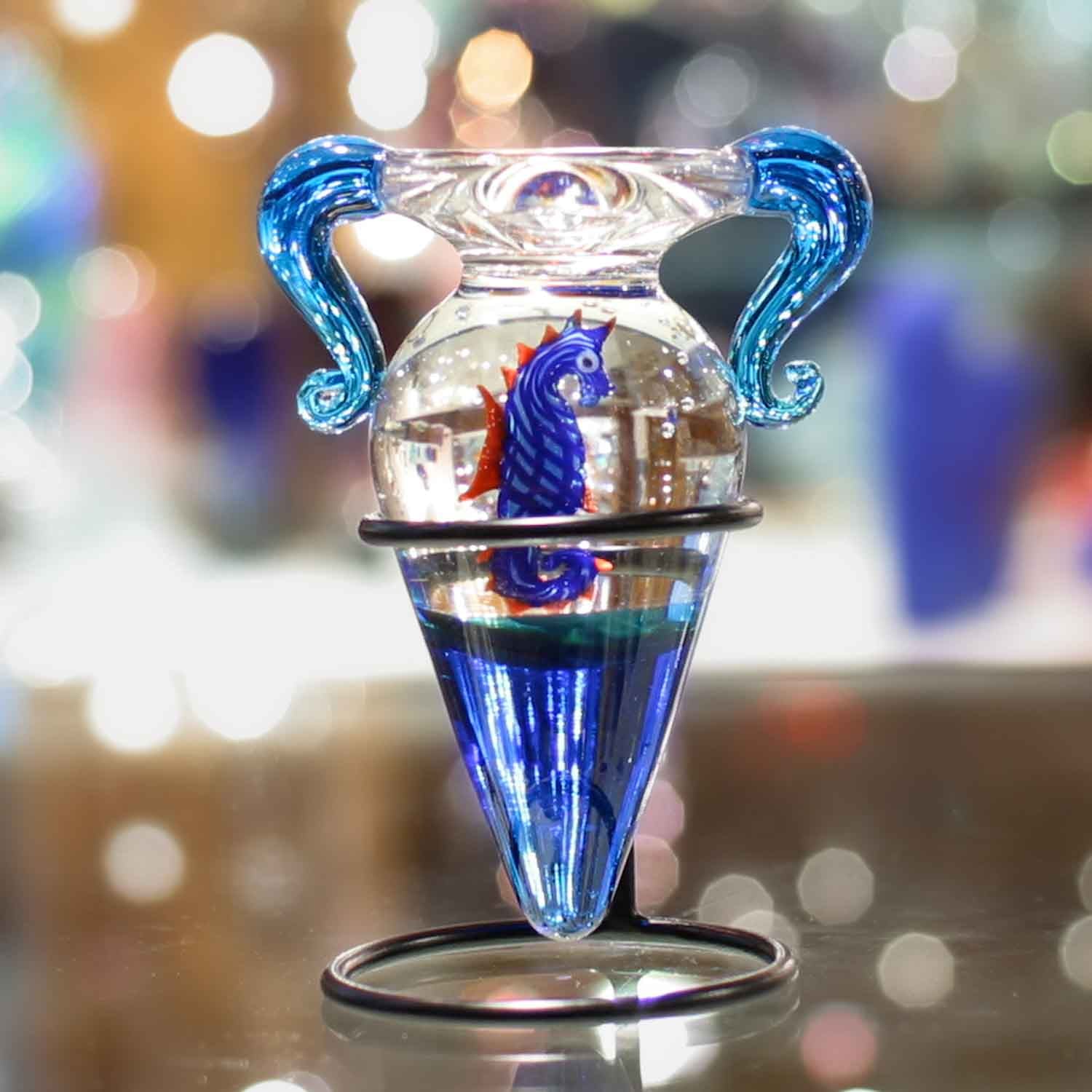 This funny seahorse is executed a lume. It means that a single master makes the piece using a gas flame to fuse and to model sticks of colored Murano glass they are called canna. Our glassworks are made by the best-established glassmakers in Murano, younger craftsman frequently try to make similar subjects, but hardly they has the experience necessary to arrive to the same results in terms of quality and visual impact.