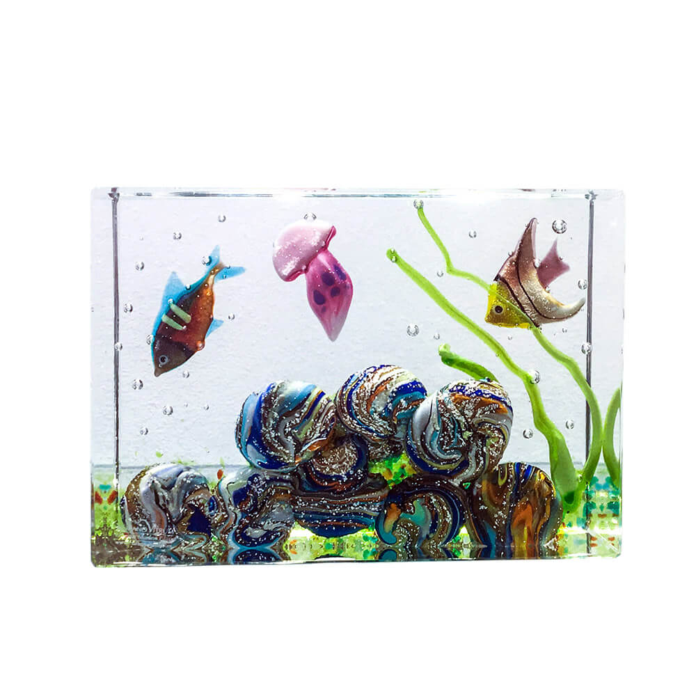 The main body is made in massello glass whereas the fishes and seaweed are prepared apart and then included in the crystal body.Read more about Murano glass Aquariums on our blog: click here