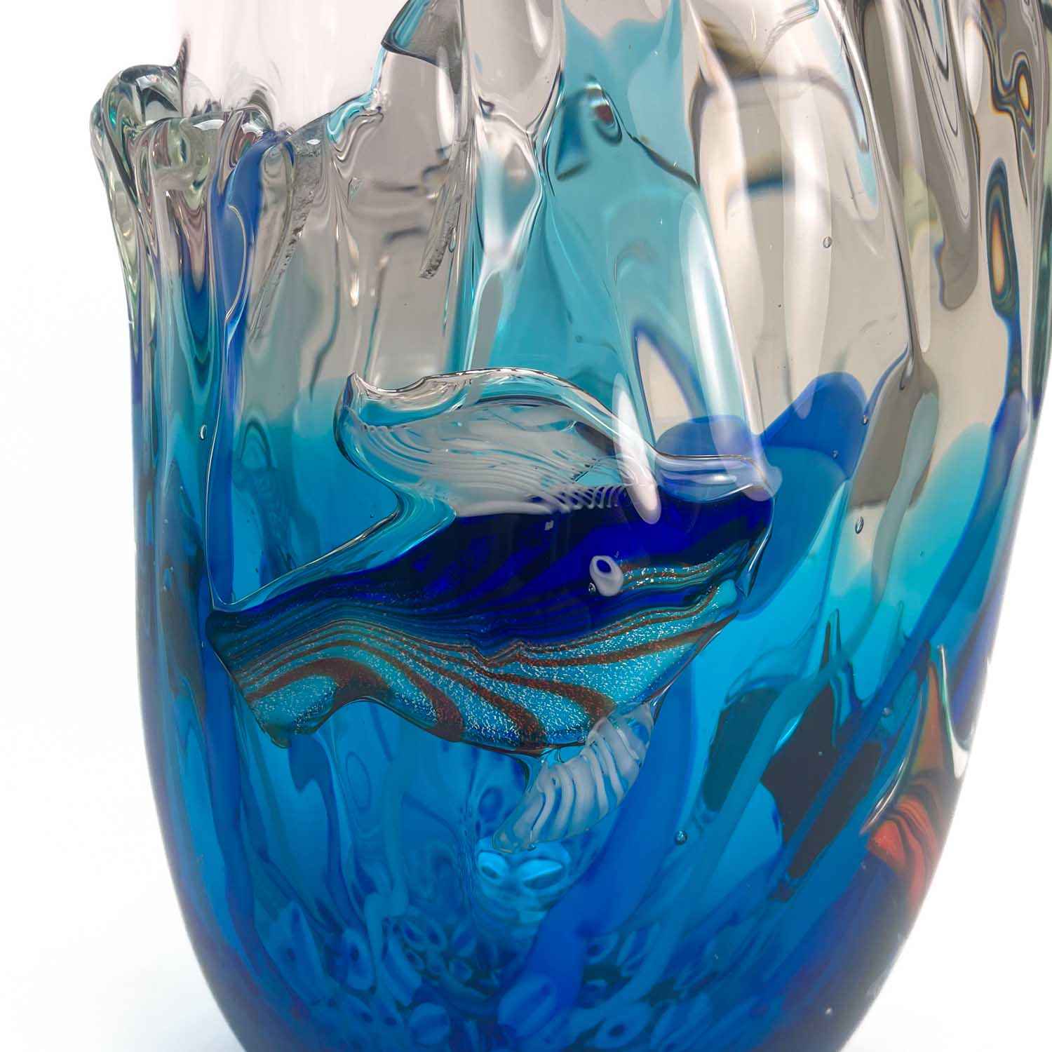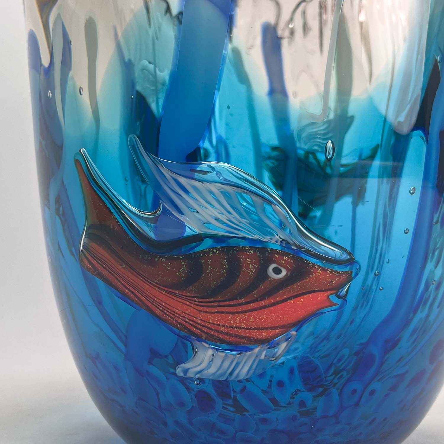 This peculiar vase is a signed piece made in 1998 in Murano by maestro Giuliano Tosi. Why peculiar? Because of the techniques used: it is made in blown Murano glass with the inclusion of fishes, designed and prepared by the artist and made in furnace instead of with the a lume technique - used in almost all the Murano glass aquariums produced nowadays - as happened with the first aquariums made in the 50's by Cenedese (read more on our blog).