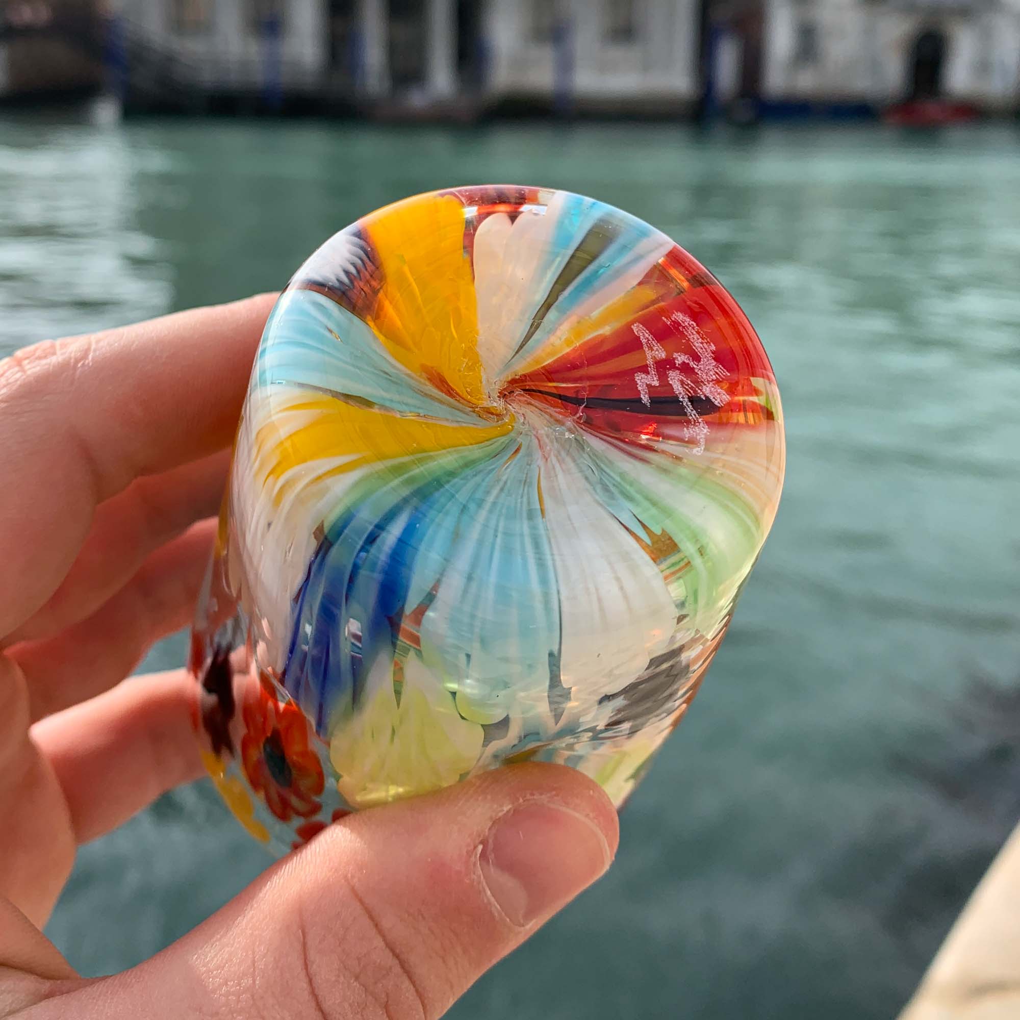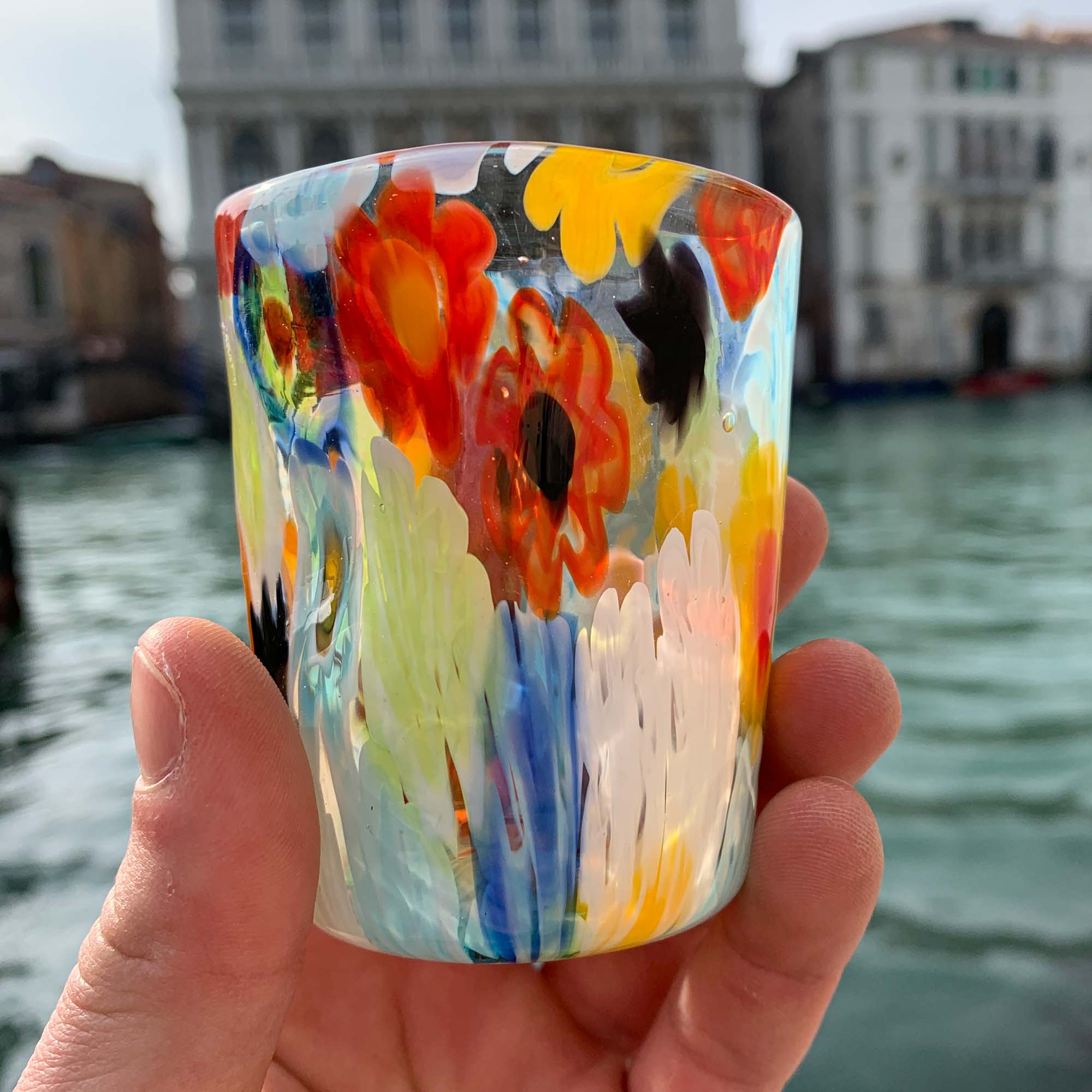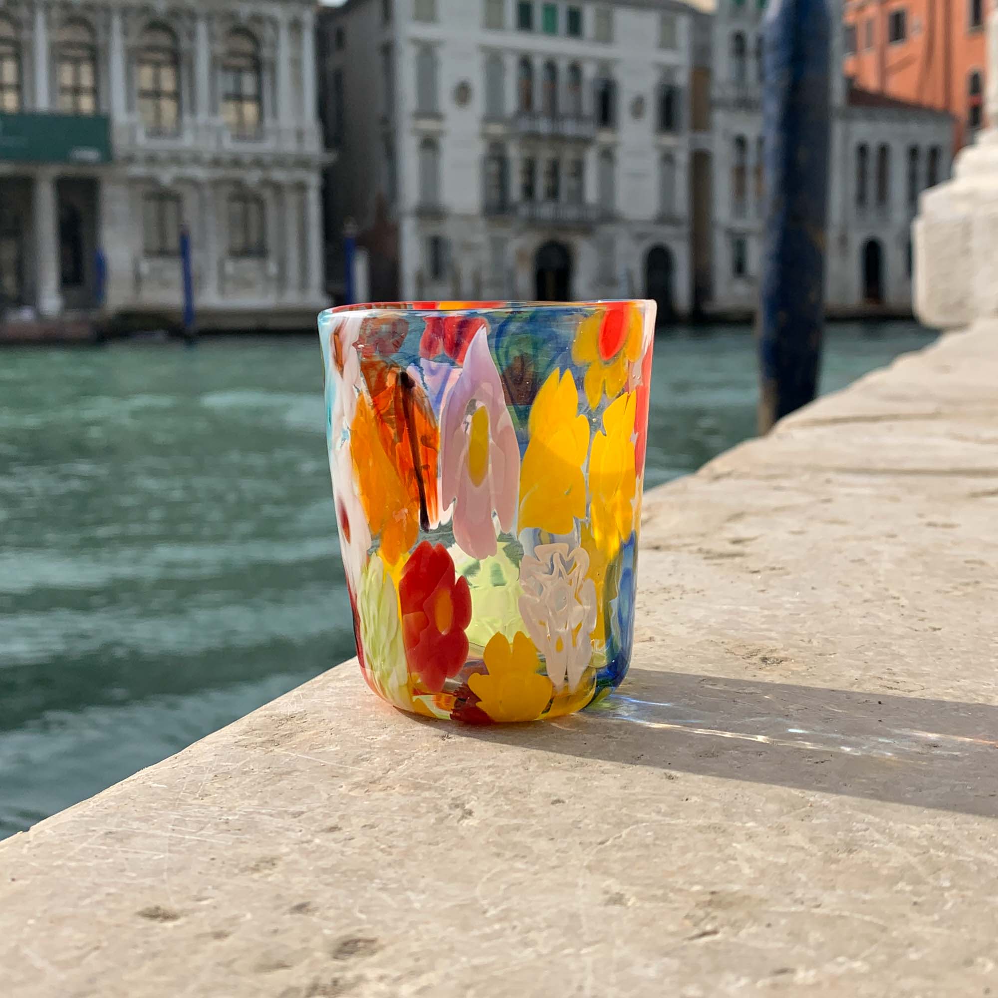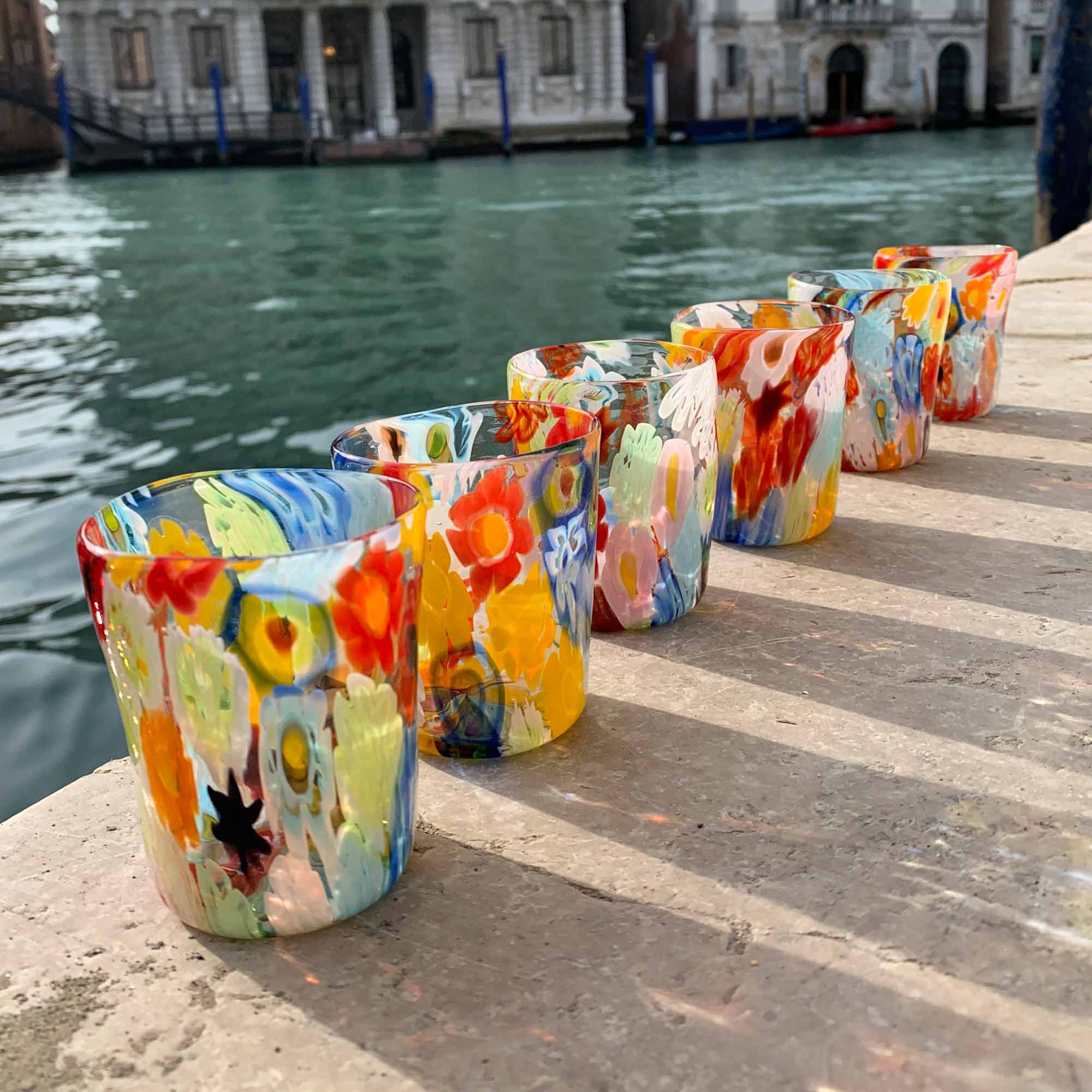 Bring this typical Murano design to your table, with its joyful murrine and original shape. The glasses have been handmade in Murano following the ancient Murano glass techniques.