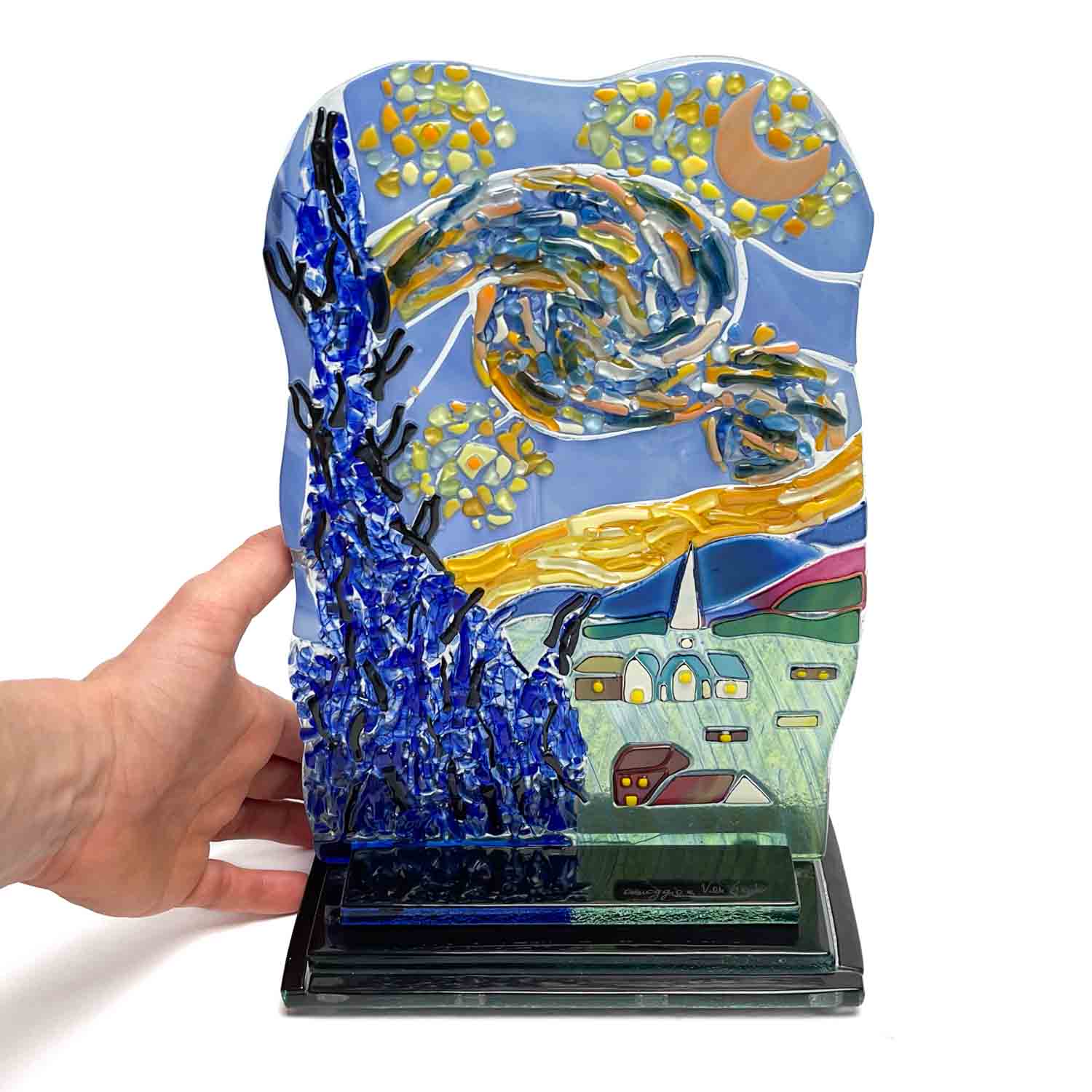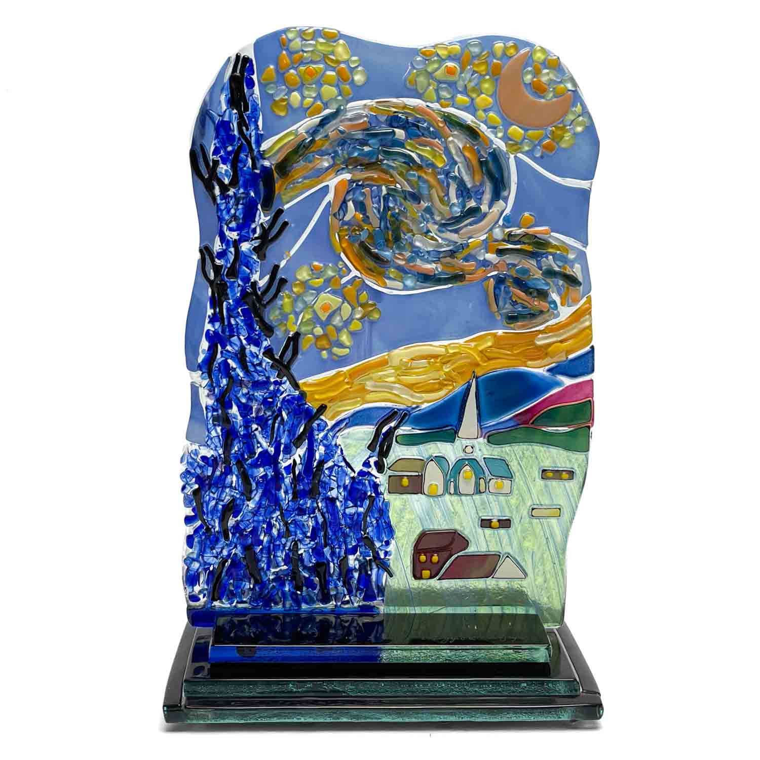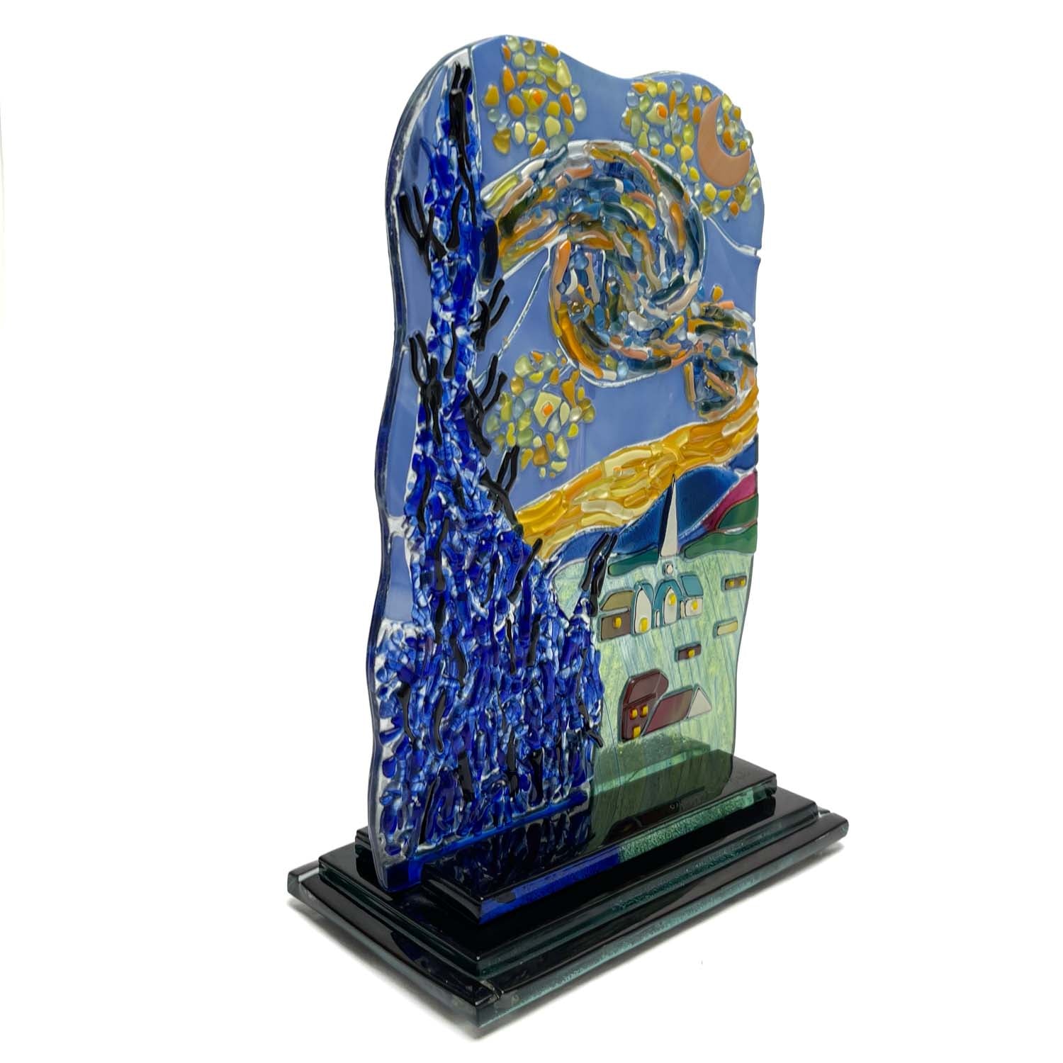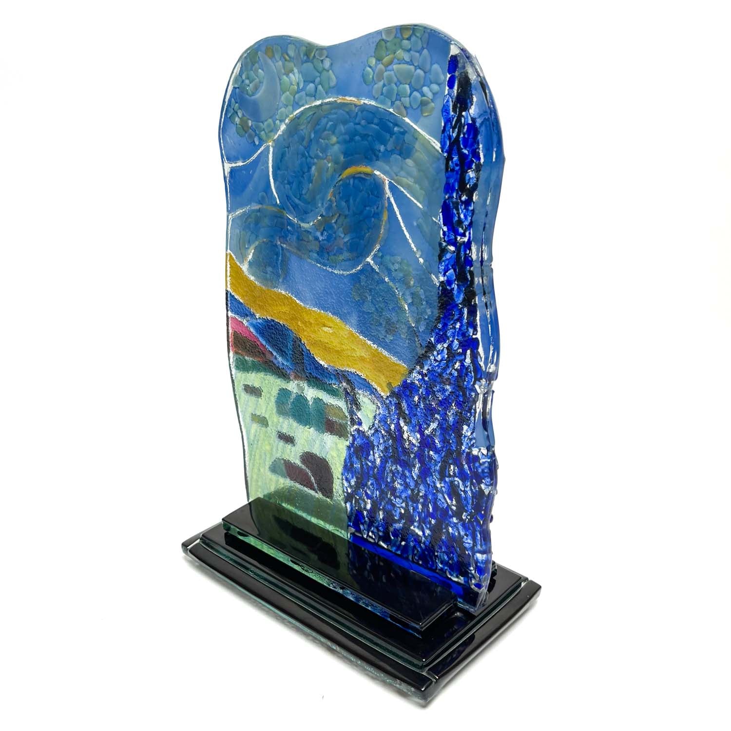 This exquisite decorative Totem captures the mesmerizing beauty of Vincent van Gogh's iconic masterpiece, "Starry Night," through the art of glass mosaic. The sculpture shows the enchanting night sky that has become synonymous with Van Gogh's name.